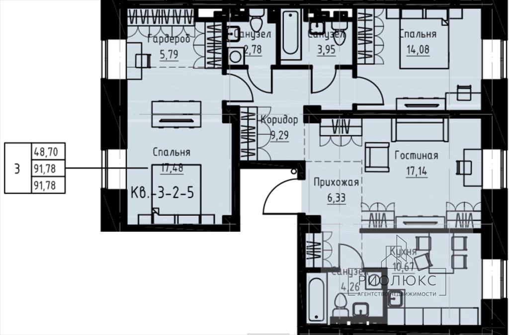 общая 91,78 м2, жилая 48,7 м2, кухни 11 м2 |