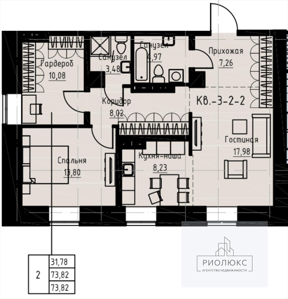 общая 73,82 м2, жилая 31,78 м2, кухни 9 м2 |