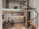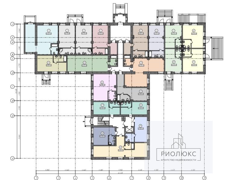 • Стены и колонны отделаны микроцементом цвета: сигнальный серый, графитовый серый, сигнальный белый