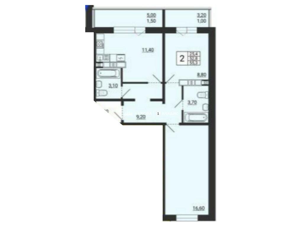 Объект расположен на 2 этаже 10-этажного монолитного дома. Общая площадь квартиры — 55,3 кв. м, из которых 25,4 кв. м — жилая площадь, а 11,4 кв. м — площадь просторной кухни.